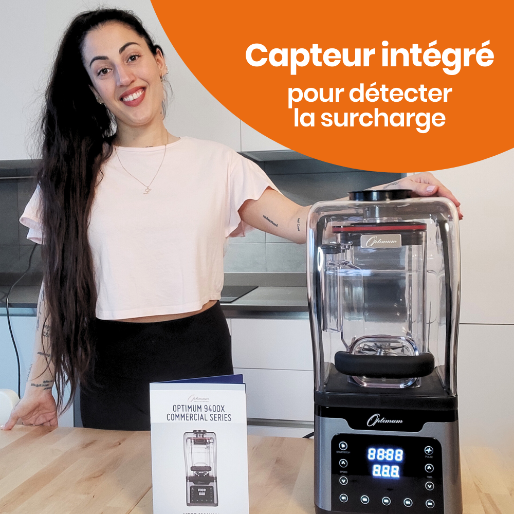 Fonction de sécurité : | Capteur intégré pour détecter la surcharge. L'Optimum 9400X a été conçu pour la sécurité de l'utilisateur et dispose d'un micro-interrupteur qui empêche la mise en marche si le récipient n'est pas correctement positionné sur la base. | Arrêt automatique |