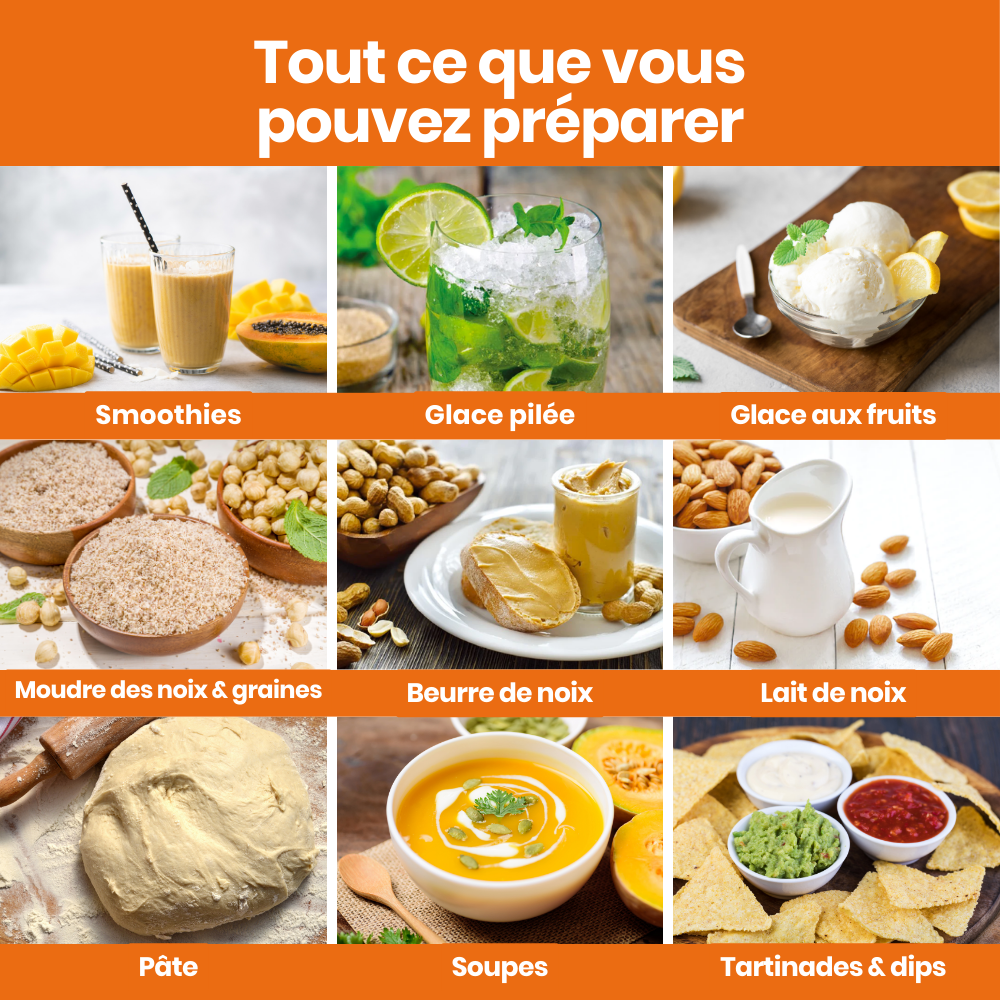 Il peut réduire en purée, hacher, traiter, mixer et chauffer les aliments. Les lames en acier inoxydable peuvent couper presque tout, des amandes au fromage. Préparez de la crème fouettée, du beurre d'amande et même Crème glacée avec l'appareil de cuisine ultime qui facilite la préparation des aliments.